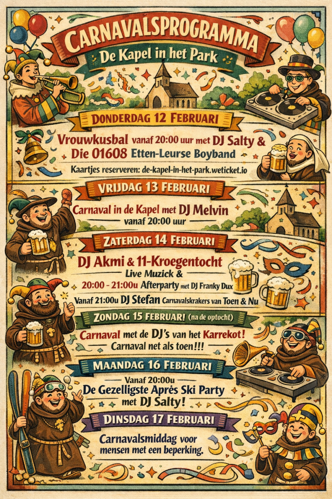 Een overzicht van alle geplande activiteiten en evenementen in de Kapel in het Park