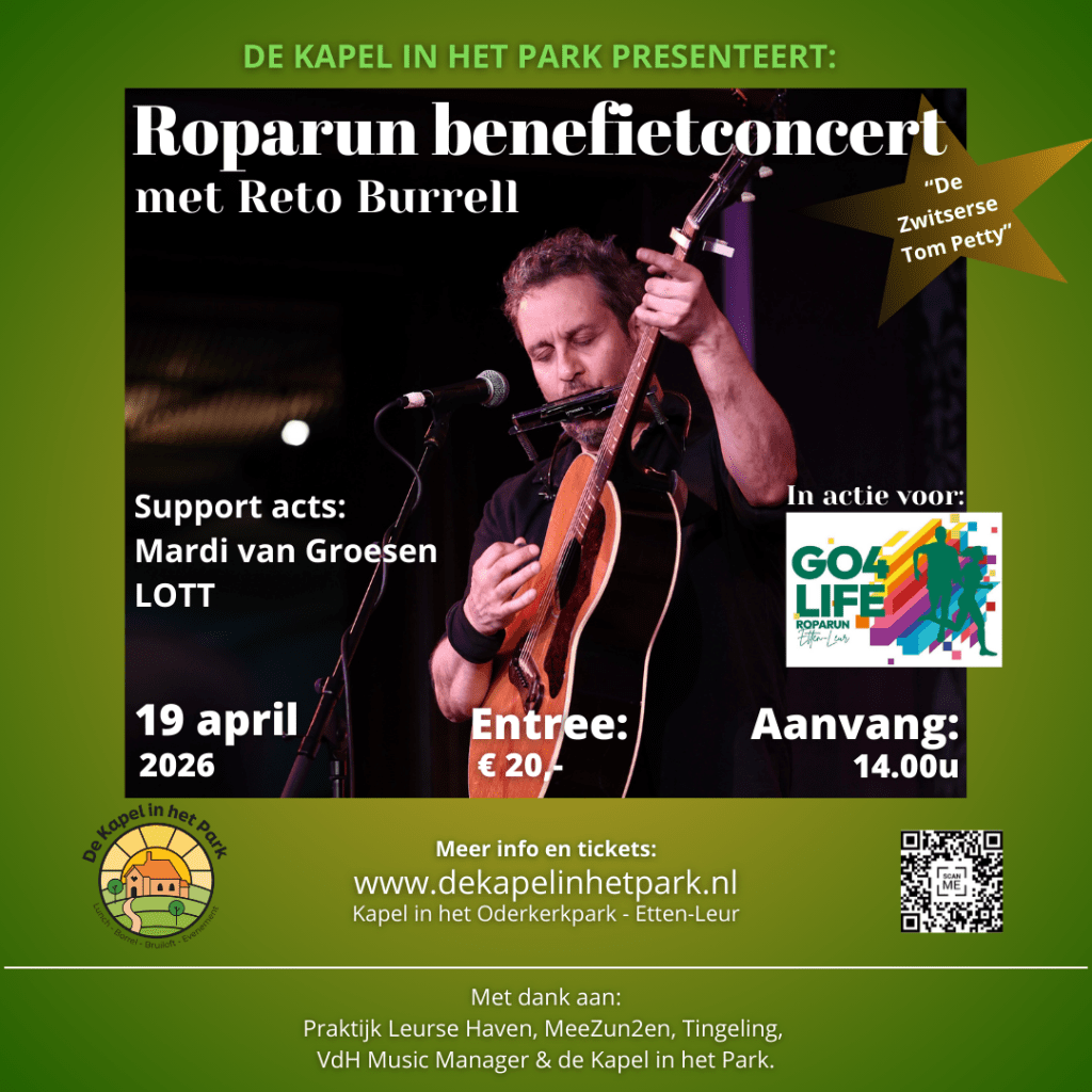 Op zondagmiddag 19 april 2026 keert het Roparun benefietconcert terug naar De Kapel in het Park voor zijn derde editie. Dit jaar staat de Zwitserse singer-songwriter Reto Burrell centraal met support van Mardi van Groesen (Etten-Leur) en LOTT (Breda).